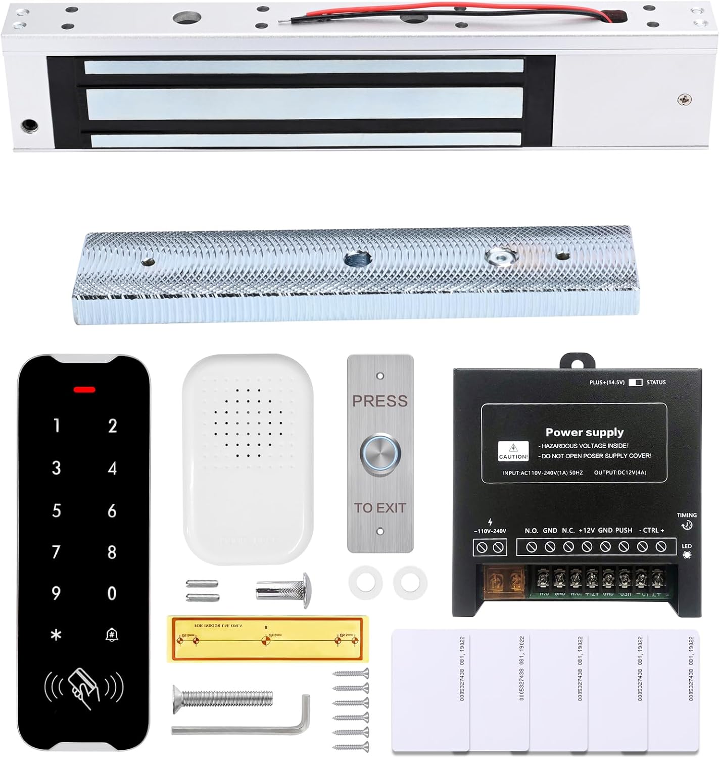 | BuiltIn Media | 1 x Access control keypad 1 x 1200LBS electric magnetic lock 1 x Power supply control 1 x Push to exit button 1 x Doorbell Chime 5 x RFID Card 1 x English user manual |